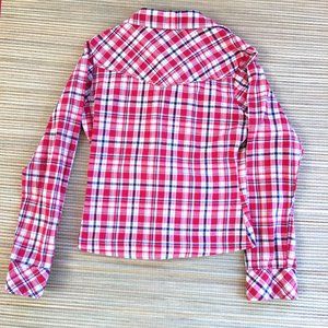Good preowned condition. Long sleeve. Snap buttons except for the very top button. Size small. Approx. flat measurements in inches: