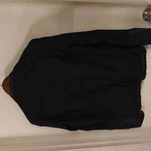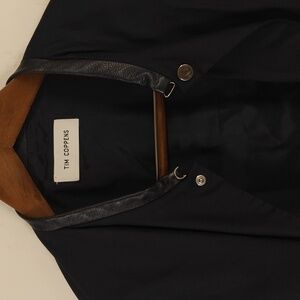 High end luxury lightweight jacket by Tim Coppens. Leather details at collar, waist and arms. Optional zips for wrists. Subtle geometric stitching on front and back. It's a very deep blue hue. I sadly outgrew it or I would definitely keep it in my collection.