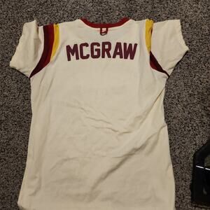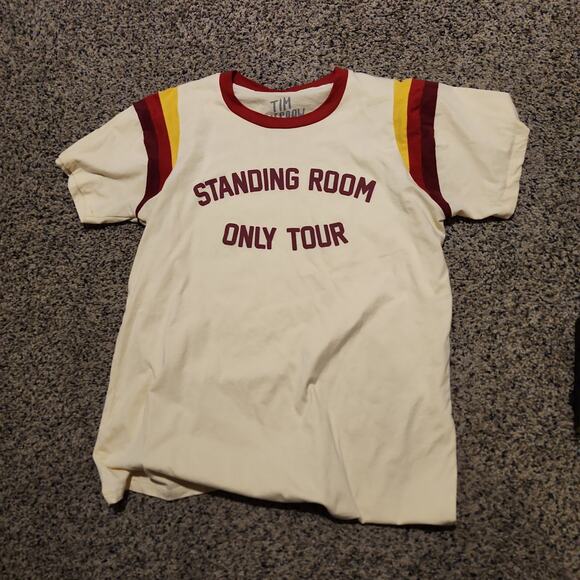 This is an official Tim McGraw "Standing Room Only Tour" cream ringer t-shirt with red and yellow striped sleeves.