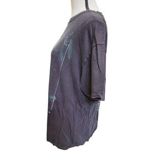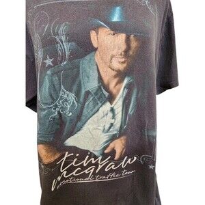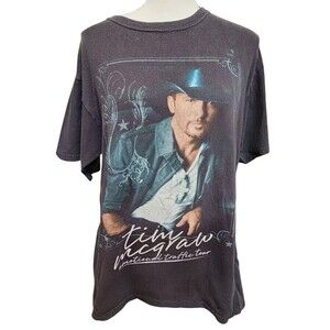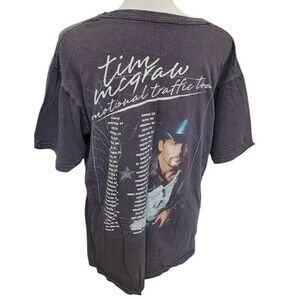 Show off your love for Tim McGraw with this black band t-shirt featuring his Traffic Tour design. Made for country music fans, this original piece of entertainment memorabilia is a must-have for any collector. The shirt is available in size large and is perfect for wearing to concerts or displaying as part of a fan's collection. The shirt's country/region of manufacture is unknown, but its quality and design make it a valuable addition to any fan's wardrobe or memorabilia collection. Get yours today and show your support for Tim McGraw's country music legacy. No tags, please see measurements. CLOTHING AND FABRIC ITEMS: All clothing and fabric items have been steam cleaned and/or washed.