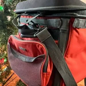 Large Stylish Timber Ridge Cooler in red and black with two smaller red and yellow additional coolers. Perfect for carrying essential snacks and food for a family going on an adventure!