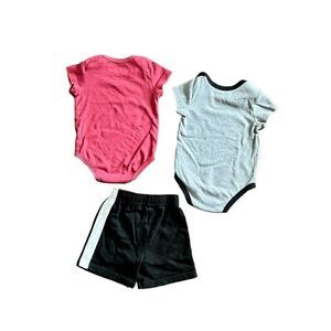 Timberland 3 Piece Set Red Grey Bodysuit Black Short Graphics sz 18 months. All 3 pieces in gently used condition. All snaps in working order. No stains, rips, tears, holes or defects. Machine washable. Dryable.