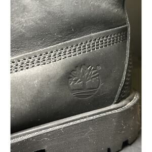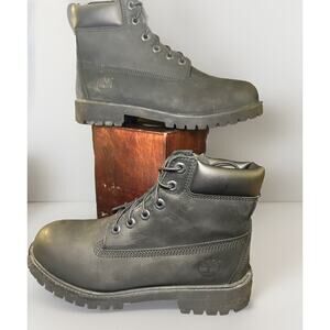 This is a pair of Timberland boots for boys in size 6, featuring a waterproof black nubuck upper with a lace-up closure. The style is solid with a round toe shape and a leather outsole. Ideal for walking, school, and hiking, these 6-inch Premium boots are designed for junior boys with a sturdy design and waterproof features.