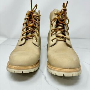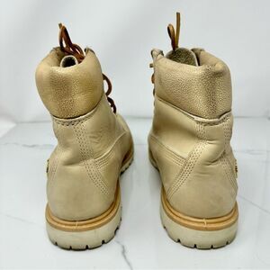 Classic Timberland 6” boots in a rare cream nubuck leather with gold ankle cuffs and gold trimmed leather square laces.