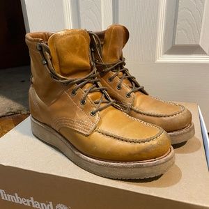 Timberland's American Craft line are designed and handmade by dedicated craftspeople in the US. These Moc Toe boots, released in 2018, are made with a Vibram outsole and premium leather. They retailed back then for $320. Lightweight for their size, pretty comfortable, and perfect for workwear or trail-to-town looks. Fair condition on these. I did wear them during a few fall and winter seasons. They do have some dark spots and stains. They're built to last decades though, and I'm sure you could fix them up and take better care of them than I did! Including the original box and storage bag. If you have any questions, let me know!