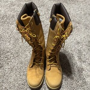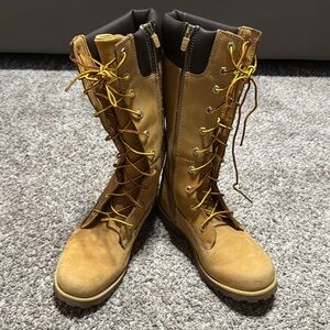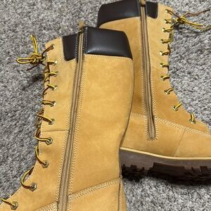 STAY WARM AND IN STYLE WITH TALL ZIP UP BOOTS FROM THE TIMBERLAND COLLECTION. THE ASPHALT TRAILS FEATURES A LEATHER UPPER, RUBBER LUG OUTSOLE, METAL EYELET LACE UP SHAFT, STITCHING DETAILS, AND A CUSHIONED INSOLE FOR COMFORT. TGESE BOOTS ARE IN LIKE NEW CONDITION.