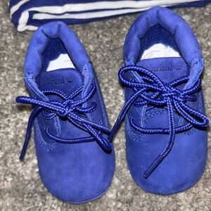 Timberland baby crib boots in size 2, blue suede with matching laces. Comes with a cozy striped Timberland beanie hat, perfect for keeping your little one warm in style!