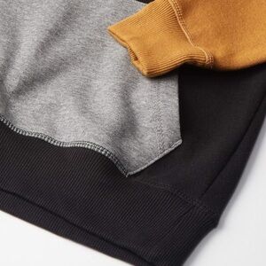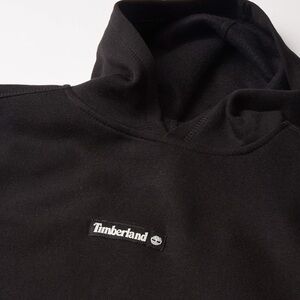 Stylish Timberland hoodie in black with gray pocket and tan sleeves. Perfect for casual wear.