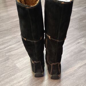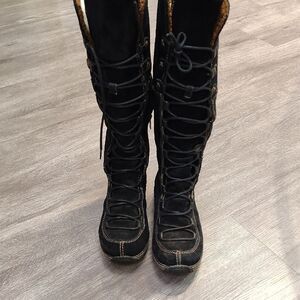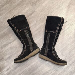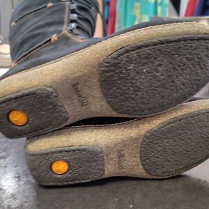 These Timberland lace-up boots in black are designed for those who appreciate a blend of style and functionality. Featuring a full-length lace-up system with metal eyelets, they offer a secure fit and a rugged look. The boots are perfect for outdoor adventures or casual outings, providing both comfort and durability.