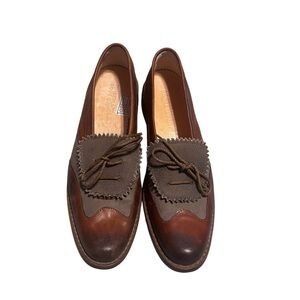 These brogues are an excellent unworn unused new without the box condition. They are genuine, leather and factory distressed. They have a canvas flap with tie on the front, but they’re slip on shoes size 7. There’s some shelfware on the bottom sole. 7M style number 676126628. Genuine leather, upper and lining, but the interior heel lining is man-made. Really beautiful and great for dark academia, academia, schoolgirl, western.
