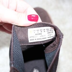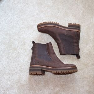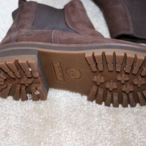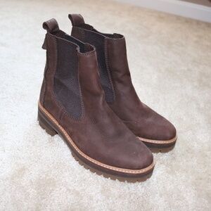 Stylish brown winter boots. Durable leather material. Slip-on design with elastic sides. Rugged sole for traction.