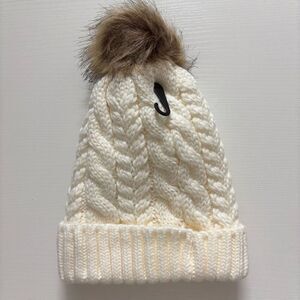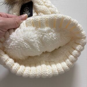 Timberland Cable Knit Cuff Beanie Faux Fur Pom Pom Fleece Lined Ivory new