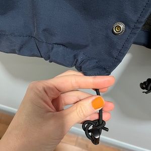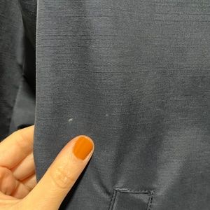 Light jacket in a great condition. There is a tiny stain on the exterior, shown in the last three photos, which can be removed from hand washing or dry cleaning. Cotton 90%, nylon 10%.