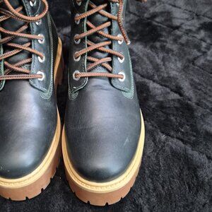 Dark Green Timberland Platform Boots. Size 7. I only wore them once. The flaws on the boots are from me moving them around in my closet. They are in great condition. I have them in the boathouse version so I don't really need both versions.