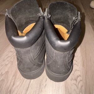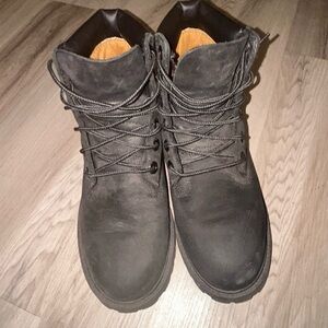 Rugged dark leather boots by Timberland. Ideal for hiking and outdoor activities.