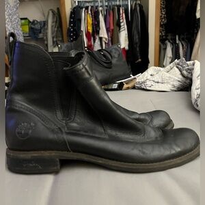 Step out in style with Timberland's sleek black leather Chelsea boots. Perfect for any occasion, these boots offer both comfort and durability, some light wear to the back of heal but otherwise in very good condition very nice supple leather comfort insoles.