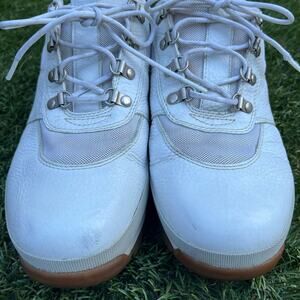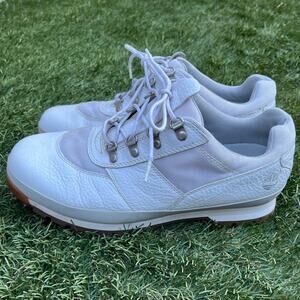 Super Rare! Hard to find this style, Especially in this colorway. True 90’s Y2K Vintage Gorpcore Lugsole Timberlands. Clean white design, hiking boot eyelets. Imprinted timberland logo on the sides of each shoe!