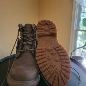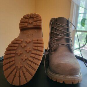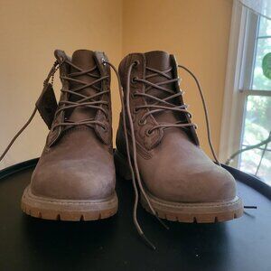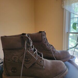 Timberland abstract print on side panels, Grey Leather Nubuck Lace Up Boots. Gently used in good condition. Minor signs of wear see all the pictures.
