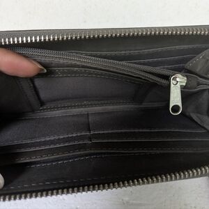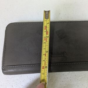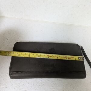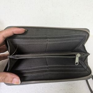 Stylish gray leather wallet by Timberland. Features a sleek design with a wrist strap.