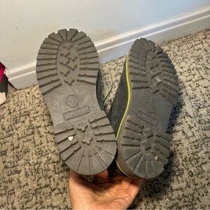 Timberland Green & Safety Grey Suede 6” Premium Waterproof Boots. Has some scuffing along the sides. As shown in photos above. Has a white mark near the toes. Also shown in photos above. Minimal signs of wear on the bottoms. Also shown in photos above. In otherwise great preowned condition. Feel free to make a reasonable offer through the offer button!