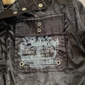 This Timberland jacket is designed for outdoor adventures, featuring a durable black exterior with faux fur lining for added warmth. The jacket includes a hood, multiple pockets, and a stylish design suitable for casual wear. Perfect for winter outings, it combines functionality with style. See measurements in photos.