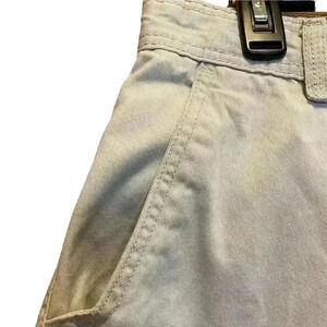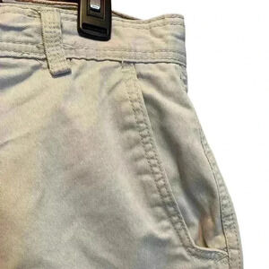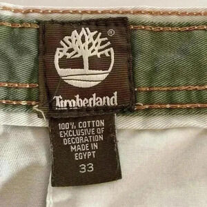 Timberland Khaki Short. 100% Cotton. Size 33. Front fly zipper and button waist. 7 belt loops. Zipper fully functional. Flat front. Side pockets and back flap pockets with button closure. Two extra buttons included. Measurements laying flat: waist 17”, inseam 10.5”, cuff 12.25”, front rise 11.75”, back rise 15.25”. Pet free smoke free environment