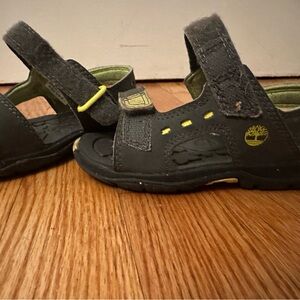 Stylish Timberland sandals with black and green design. Perfect for active kids. Durable and comfortable.