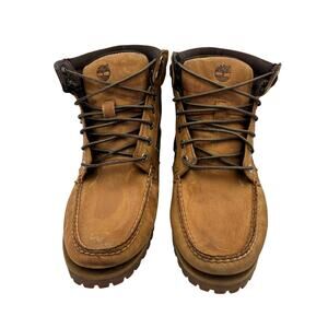 Classic tan color with moc-toe stitching, padded collar, and durable lug outsole. These boots show normal wear with some creasing and surface marks (see photos), but overall they’re in good pre-owned condition and still built to last—perfect for everyday wear, work, or outdoor use.