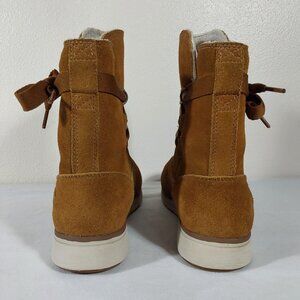 Insulated waterproof boots for day-to-day wintertime wear. Waterproof membrane helps keep feet dry in snow and slush. Primaloft insulation helps keep feet toasty warm. Plush fuzzy interior. Odor-fighting footbed offers breathable comfort. Triple-layer cushioned midsole provides a smooth ride on frosty ground. Lugged rubber grippy sole adds superior traction on icy surfaces. Tan suede upper. Tie detail. Condition: Good with signs of gentle use.
