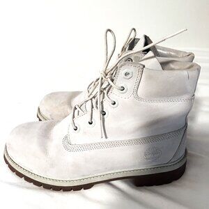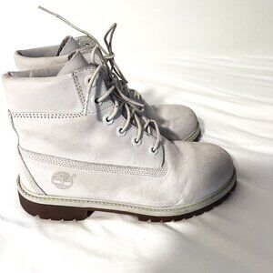 These are a youth size 5.5, which is the equivalent of a women's size 7.5. These are the classic lace-up style with a durable rubber sole. They feature the Timberland logo on the side and a padded collar for a comfortable fit around the ankle. Perfect for casual wear, they are a versatile light grey color that can be styled for any season. The boots are made with premium leather and have a waterproof construction. The boots have a treaded outsole for good traction.
