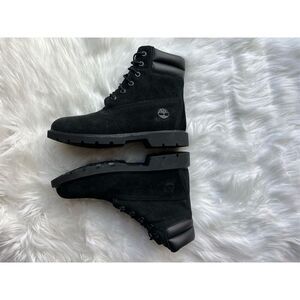 Keywords: Timberland, women's booties, black suede, waterproof, casual, outdoor, lace-up, ankle boots, flat heel, size 7.5, fall fashion, durable, comfortable, iconic logo, round toe.