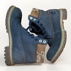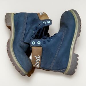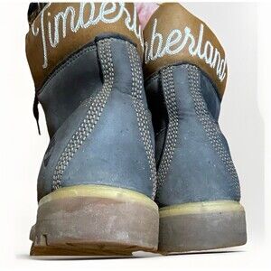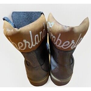 Timberland, mens 10.5, brown boots, logo collar, leather, lace-up, rugged, outdoor, streetwear, hip hop, workwear, Y2K style, heritage, lug sole, classic