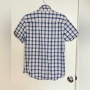 Men’s Timberland short sleeve button-down shirt with a navy and white plaid design.