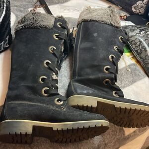 Timberland Mirney black grey fur leather suede lace up knee high boots tims 8.5