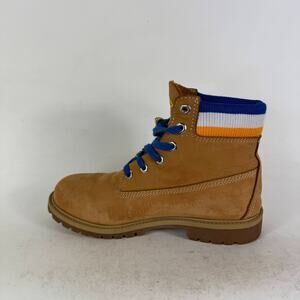 These boots will also fit a US women's size 9 per size chart. The Timberland Mitchell & Ness NBA Golden State Warriors Boots in size 7 for kids feature a brown leather upper with a round toe shape and ankle shaft style. These lace-up combat boots are designed for comfort and adjustability, with cushioned insoles and rubber outsoles suitable for walking, baseball, and hiking activities. The boots also showcase the Golden State Warriors logo accents, making them a stylish choice for travel, activewear, or casual wear during the fall, winter, and spring seasons.