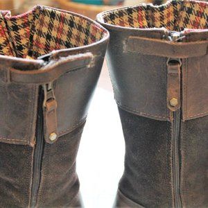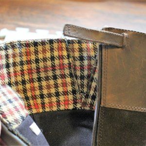 Dark brown leather & suede with side top buckle and plaid lining at top