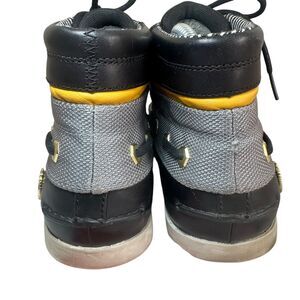 Timberland Oakwell 7 Eye Moc-Toe Boots for men in black leather with a round toe shape. These lace-up boots feature a gold emblem accent, are lightweight, comfortable, and anti-fatigue. Suitable for casual and workwear, with a vintage style and outdoor-hip hop theme. The outsole is made of leather, and they are designed for winter and fall seasons. The Timberland Boot Company product line offers quality craftsmanship in this ankle boot style. Shoes come as is. No box included. Great condition. No rips/holes/tears/excessive stretching/stains/discoloration/snags. Kept in a smoke/pet free home.
