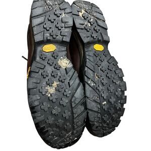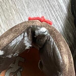 Signs of wear. Interior heel pad on one shoe worn. Toe rubber cap slightly pulling away from shoe (see photo). Original inserts replaced with Hoka inserts.