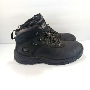 Timberland Mens Flume Mid Steel Safety Toe Waterproof Work Boot. Size 11W. ANSI safety standards. Slip and abrasion resistant outsoles. Seam-Sealed Waterproof Leather Upper