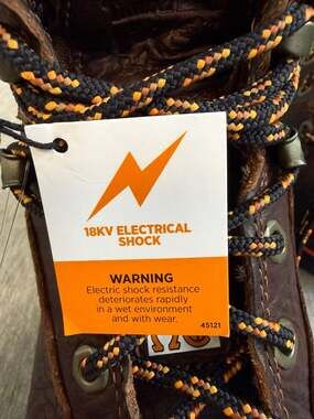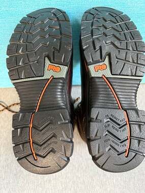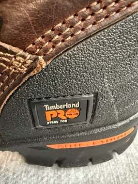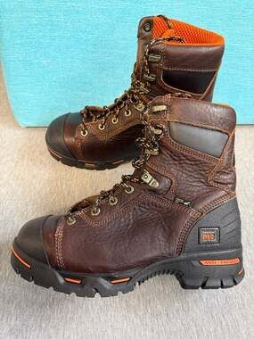 Timberland PRO Men's Steel Toe Work Boots, Leather Outer, Size 8W — Premium safety footwear for tough environments. These boots feature a heavy-duty puncture-resistant sole and steel toe protection for maximum safety. Equipped with Timberland's Anti-Fatigue technology for all-day comfort and an oil-resistant, slip-resistant, non-marking outsole for superior traction. Brand new condition with original safety tags attached. Includes 18KV electrical shock resistance certification (ASTM/CSA). High-top lace-up design with durable tumbled brown leather and breathable mesh lining.