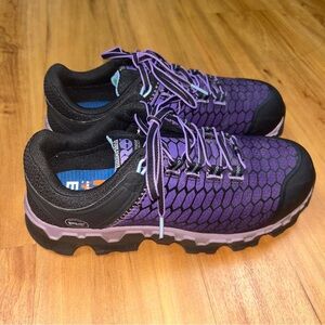 Step into adventure with Timberland's vibrant purple and black sneakers, crafted for both style and performance. These sneakers feature a durable mesh and synthetic upper, reinforced toe cap, and an aggressive trail-style tread for superior grip. Perfect for outdoor activities, they offer excellent ankle support and cushioning for all-day comfort.