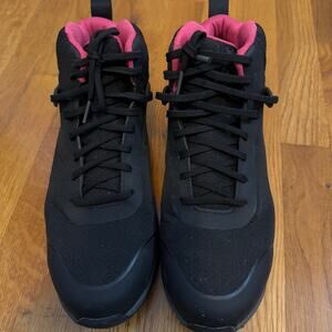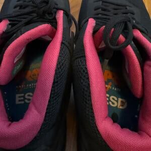 Timberland Pro Womens 10 Anti Fatigue Composite Safety Toe Work Shoe Sneaker. Comp toe. Lace up. Black exterior with pink interior lining. In good used condition. Shoes are lightly dirty, but no structural issues.