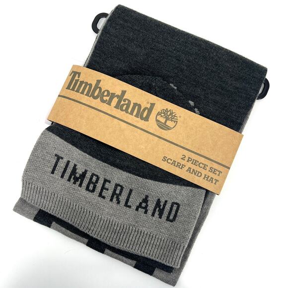 Timberland Reversible Jacquard Hat and Scarf Set in Two Tone Gray NEW