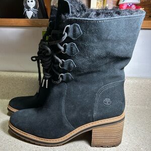 Timberland Sienna Black Suede Faux Fur Inside Mid Boots 2” Heel Size 9 GUC
