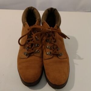 Stylish Timberland ankle boots. Tan leather with sturdy soles. Perfect for casual wear.