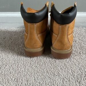 Stylish Timberland leather boots in tan. Features a durable design with a padded collar.