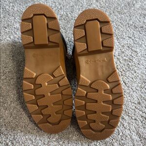 Durable Timberland boots in tan leather. Features a black padded collar and sturdy design. Non smoking home. Not worn very much. I believe it’s the 6 inch as that was most popular.