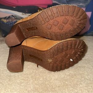 Stylish Timberland boots with a sturdy heel. Features brown and tan leather. Perfect for versatile wear. Excellent condition! Smoke free home.