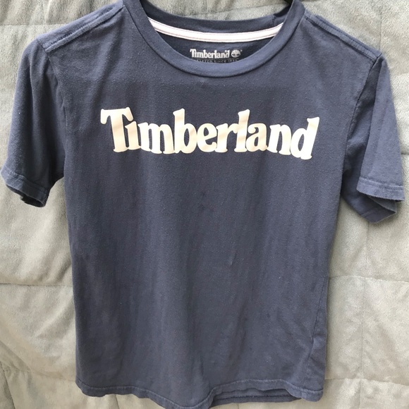 Youth medium blue T-shirt with Timberland in bold white letters across the front of the shirt and it has a solid blue back.