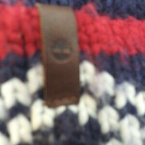 Fair Isle style hat in a wool blend will keep you warm in style. Maroon. Blue and white knit has leather logo brand tab